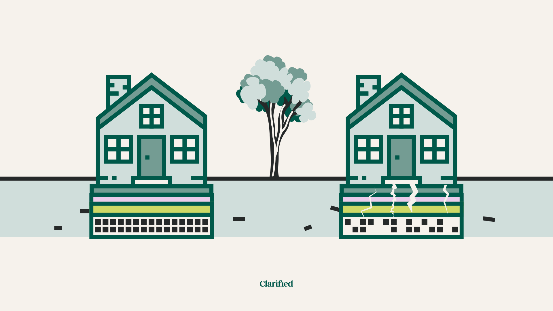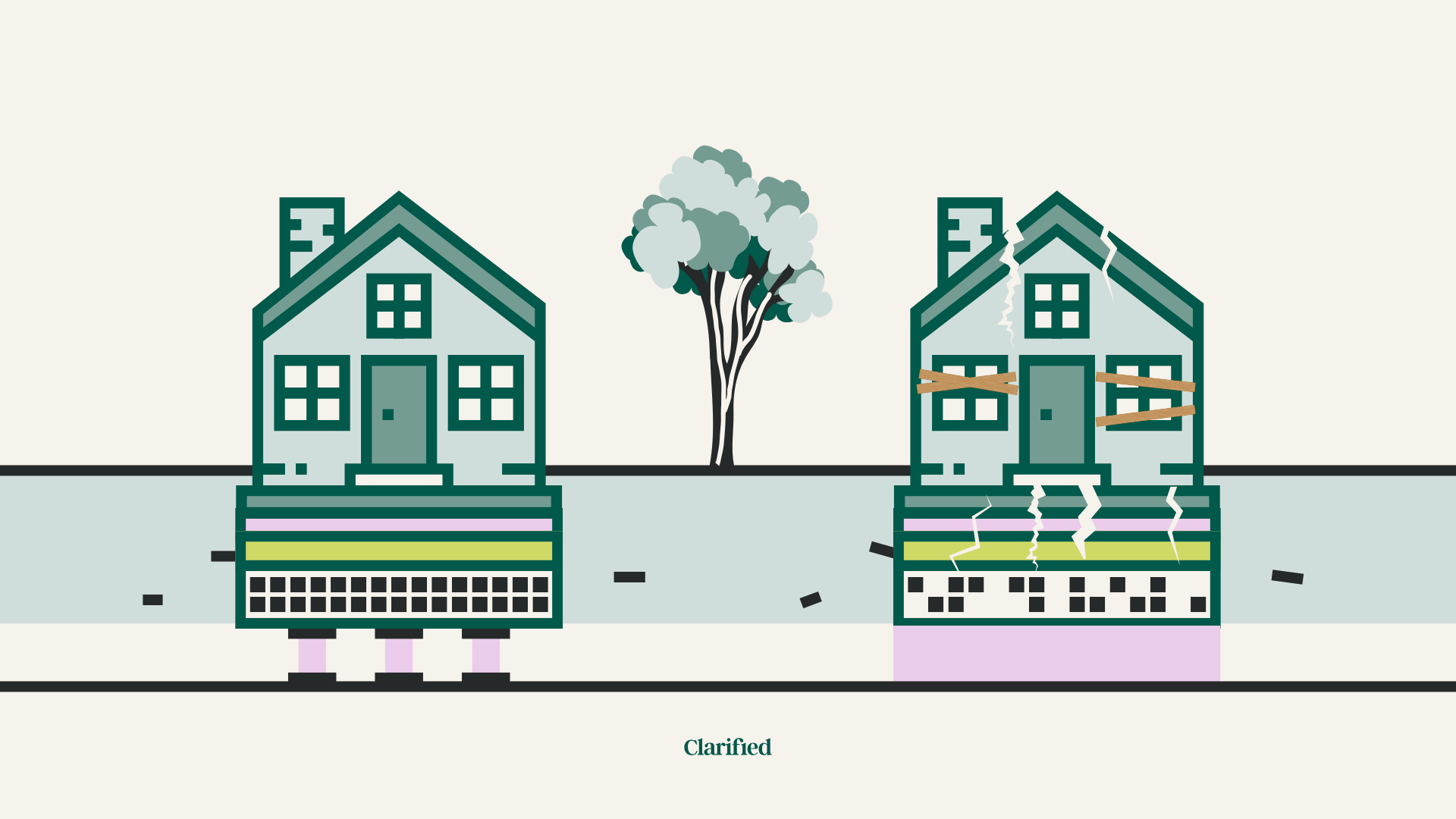 The house on the left developed a resistance to these tremors. This goes down a little deeper, below even the foundations, allowing the house to absorb the movement as the ground beneath it shifts.